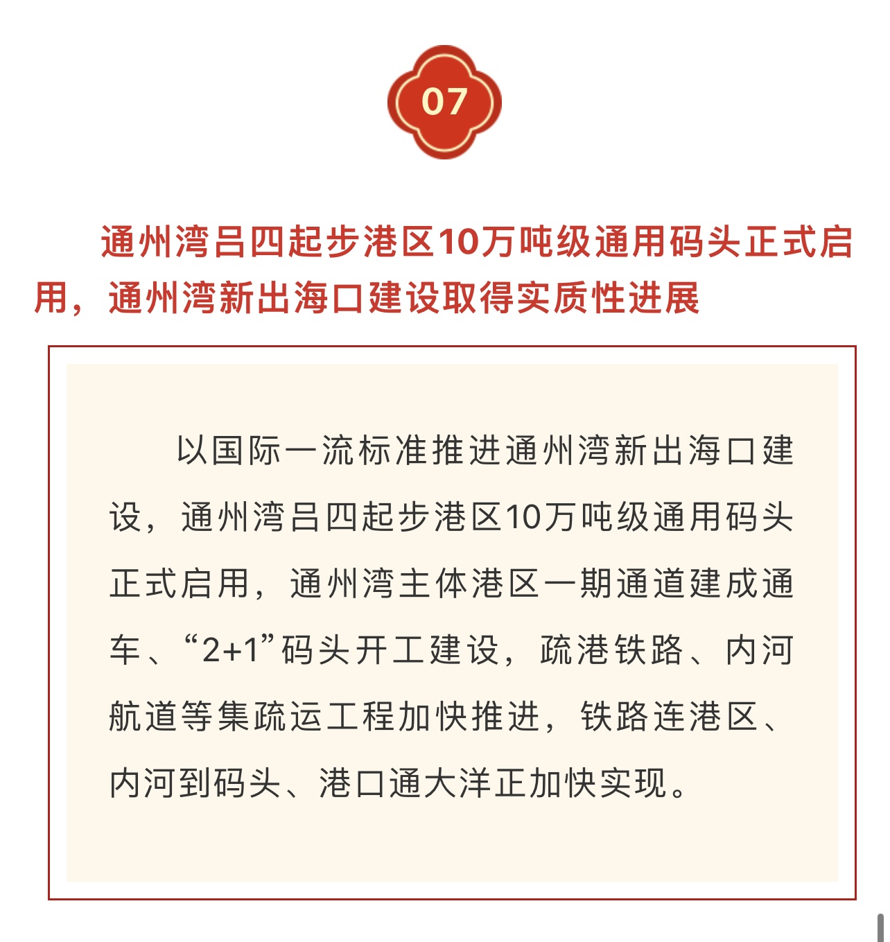 2021年,南通港(港口)集團(tuán)堅決扛牢使命擔(dān)當(dāng),堅定目標(biāo)必成信念,與參建各方凝心聚力、鉚足干勁、奮勇拼搏,以國際一流標(biāo)準(zhǔn)推進(jìn)通州灣新出海口建設(shè),全力打造優(yōu)質(zhì)工程、精品工程和廉潔工程,取得突破性進(jìn)展。通州灣新出??趨嗡钠鸩礁蹍^(qū)10萬噸級通用碼頭正式啟用,通州灣主體港區(qū)一期通道建成通車、三港池1#-3#碼頭開工建設(shè),小廟洪上延航道(一階段)、三夾沙南航道建成通航,南通港疏港鐵路一期工程全速推進(jìn),“鐵路連港區(qū)、內(nèi)河到碼頭、港口通大洋”綜合集疏運體系正加快實現(xiàn)。