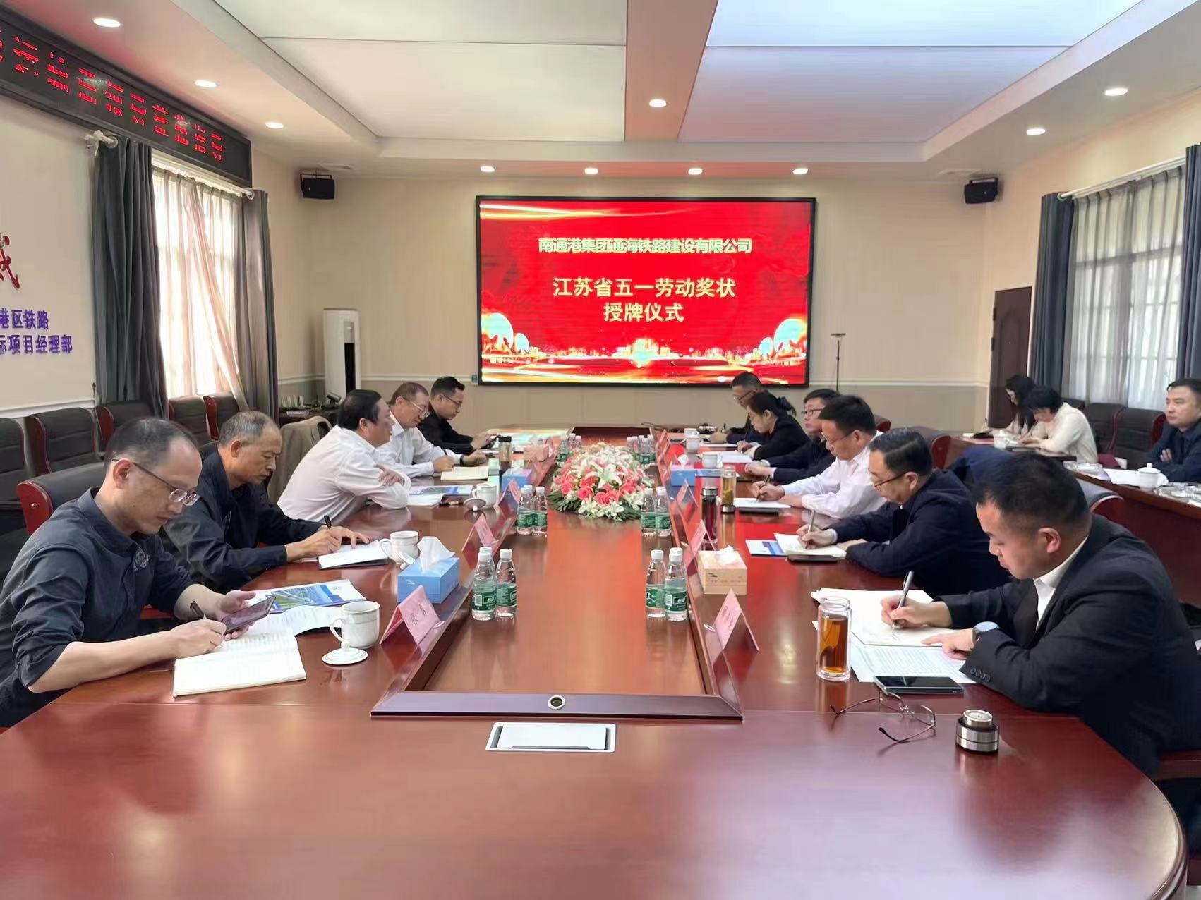 10月10日上午,南通市交通運輸局在南通港疏港鐵路一期工程一標段項目部舉行“江蘇省五一勞動獎狀”授牌儀式,市交通運輸局黨委書記、局長周建飛,局黨委副書記、市鐵路辦主任周玉兵,局黨委委員、市鐵路辦主任助理張志忠,南通港(港口)集團有限公司黨委書記、董事長朱玉強,副董事長崔劍,市交通運輸局、海門區(qū)交通運輸局相關負責同志出席活動,南通港集團通海鐵路公司班子成員參加活動。